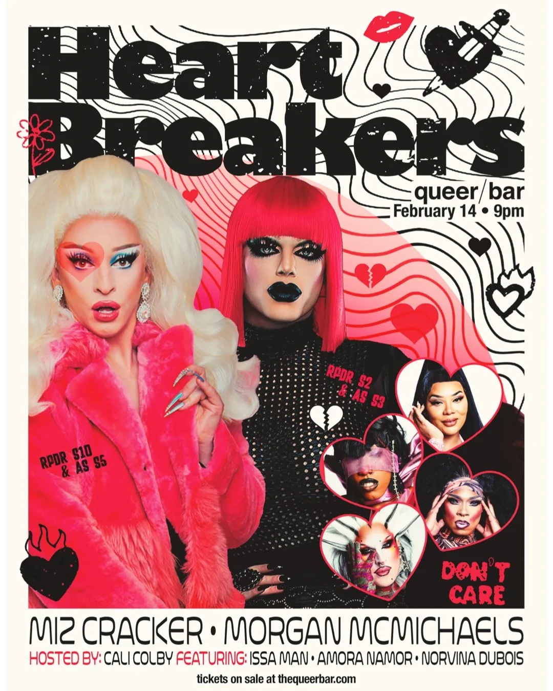 This Valentine's Day we've got something extra sweet... Join us for Heartbreakers starring RPDR alumni Miz Cracker & Morgan McMichaels! Hosted by our resident MX baddie Cali Colby with performances by Issa Man, Amora Namor, and Norvina Dubois!